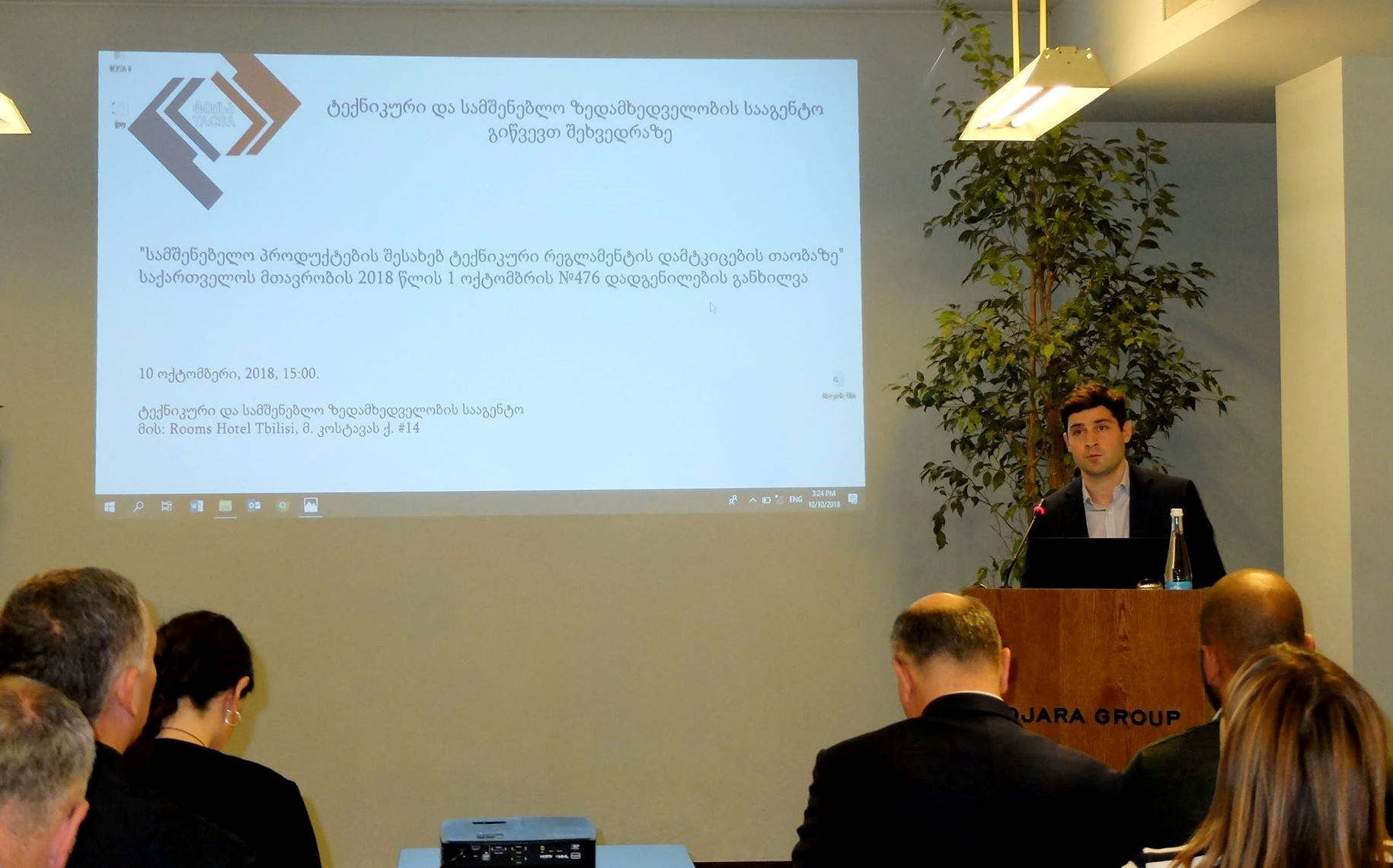 შეხვედრაზე განხილულ იქნა "სამშენებელო პროდუქტების შესახებ“ ტექნიკური რეგლამენტი, რომელიც 15 ნოემბრიდან ამოქმედდება. რეგლამენტით განისაზღვრება სამშენებლო პროდუქციის ბაზარზე განთავსების ახალი პირობები. რეგლამენტის შინაარსი მონაწილეებს გააცნო სააგენტოს უფროსის მოადგილემ, რამაზ ობოლაძემ. დამსწრე საზოგადოებას მიმართეს სააგენტოს უფროსმა გრიგოლ კაკაურიძემ და ასოციაციის დირექტორმა ანა საბახტარაშვილმა. მხარეებმა შეხვედრაზე იმსჯელეს ახალი ვალდებულებების შესახებ და დასახეს ურთიერთთანამშრომლობის გეგმები.